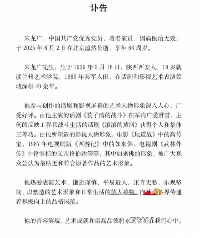 #头号创作家激发沟通#86版《西纪行》中如来佛祖的饰演者,朱龙广憨厚,于8月2日因病在北京陨命,享年86岁。 讣告一出,多量看着《西纪行》长大的不雅众心头一千里,他塑造的如来佛祖,宝相尊严开yun体育网,不怒自威,那份神韵慈悲度,号称难以逾越的经典,早已深深烙迹在不雅众心中,他等于无可替代的如来化身。
