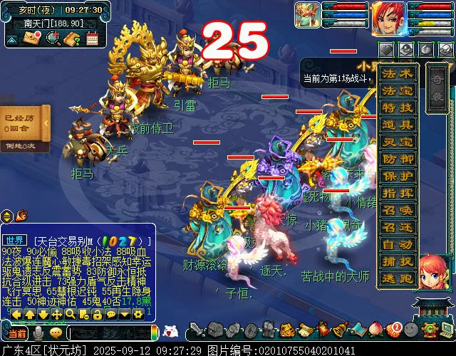 天兵:左边中速五庄,会烟雨。右边会蓄力施法,会雷击。