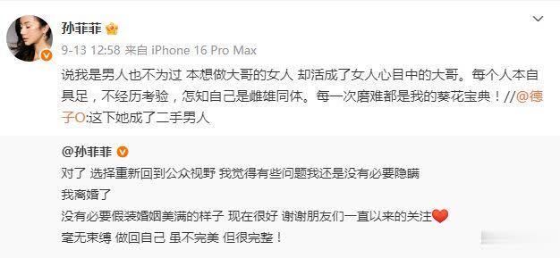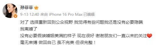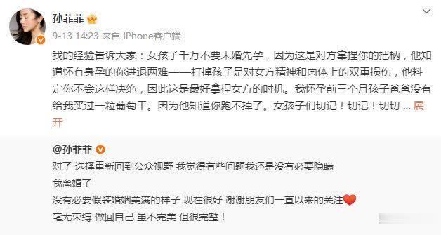 9月13日欧洲杯体育,曾以多部古装剧作红极一时的演员孙菲菲在个东说念主酬酢平台连络发布9条微博,认真告示仳离,并坦诚共享了我方婚配失败的教导与感悟。