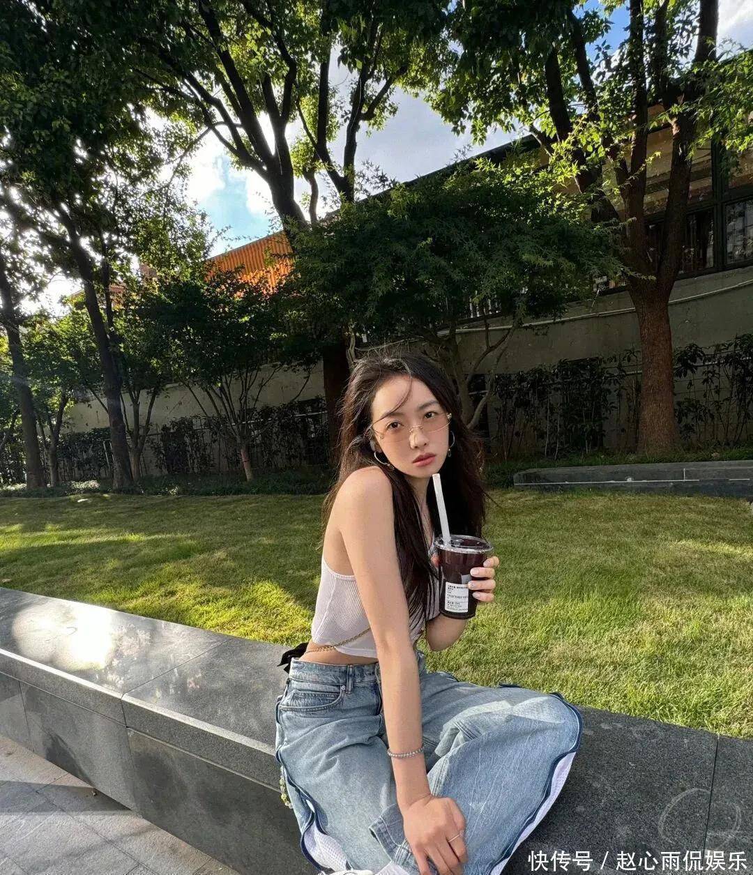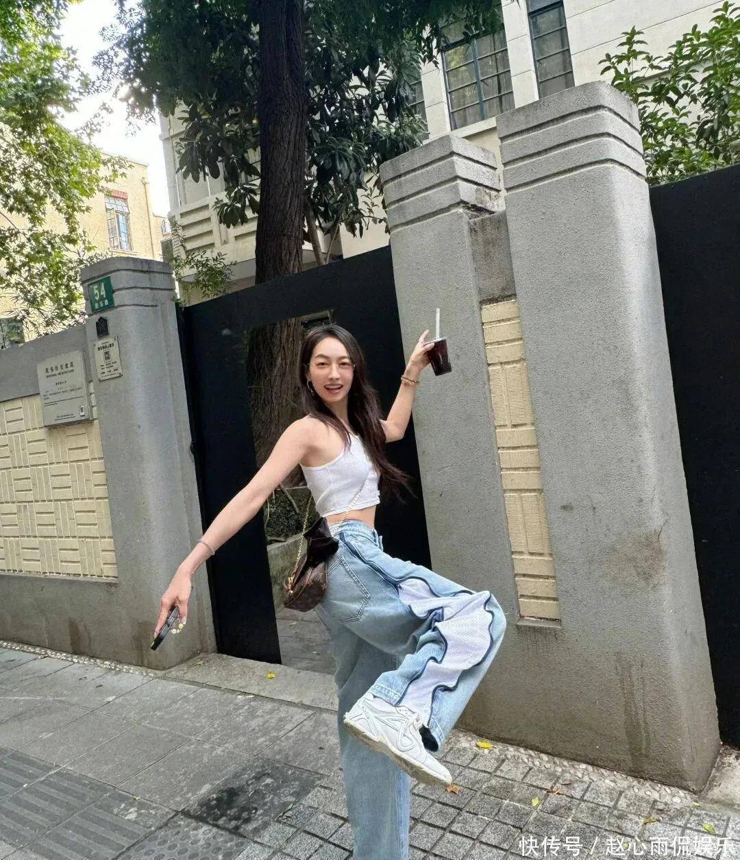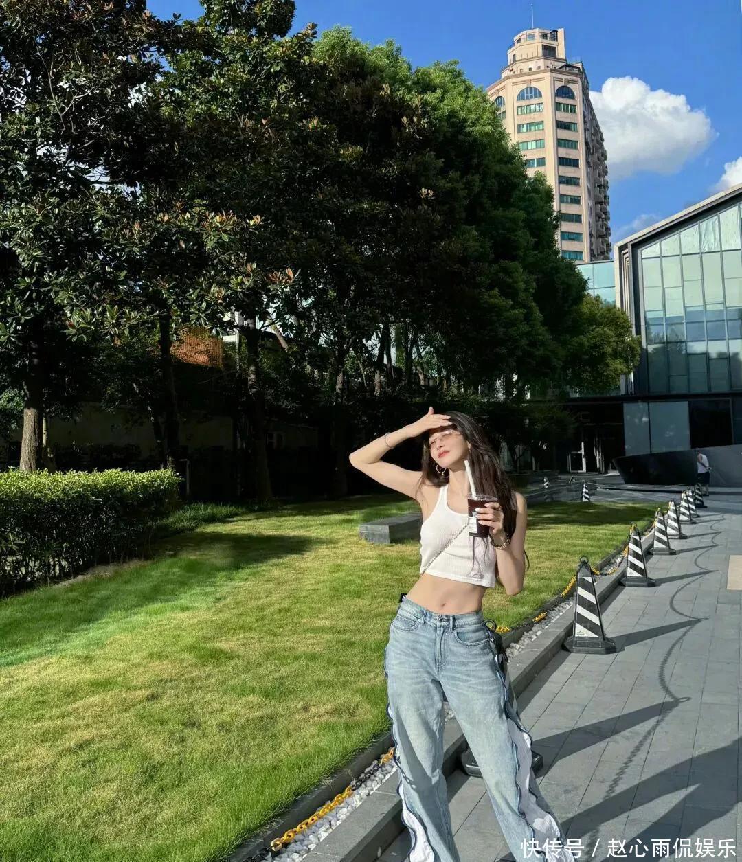 白真诚短背心配阔腿牛仔裤,手里一杯冰饮,像极了周末外出闲荡的邻家姐姐。