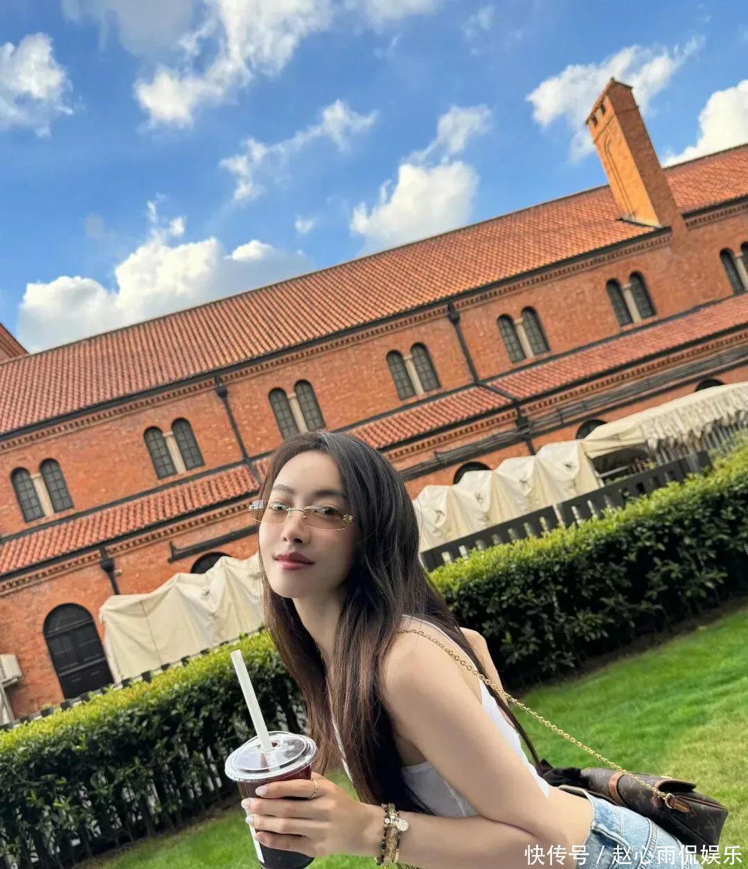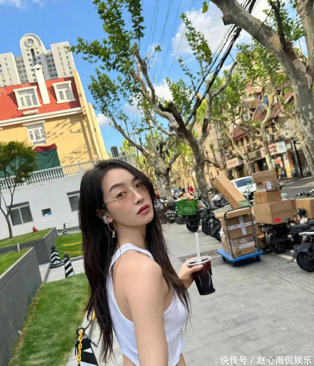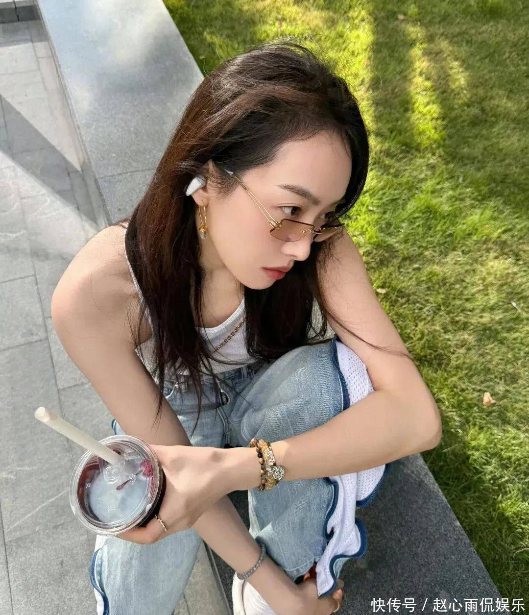 白真诚短背心配阔腿牛仔裤,手里一杯冰饮,像极了周末外出闲荡的邻家姐姐。