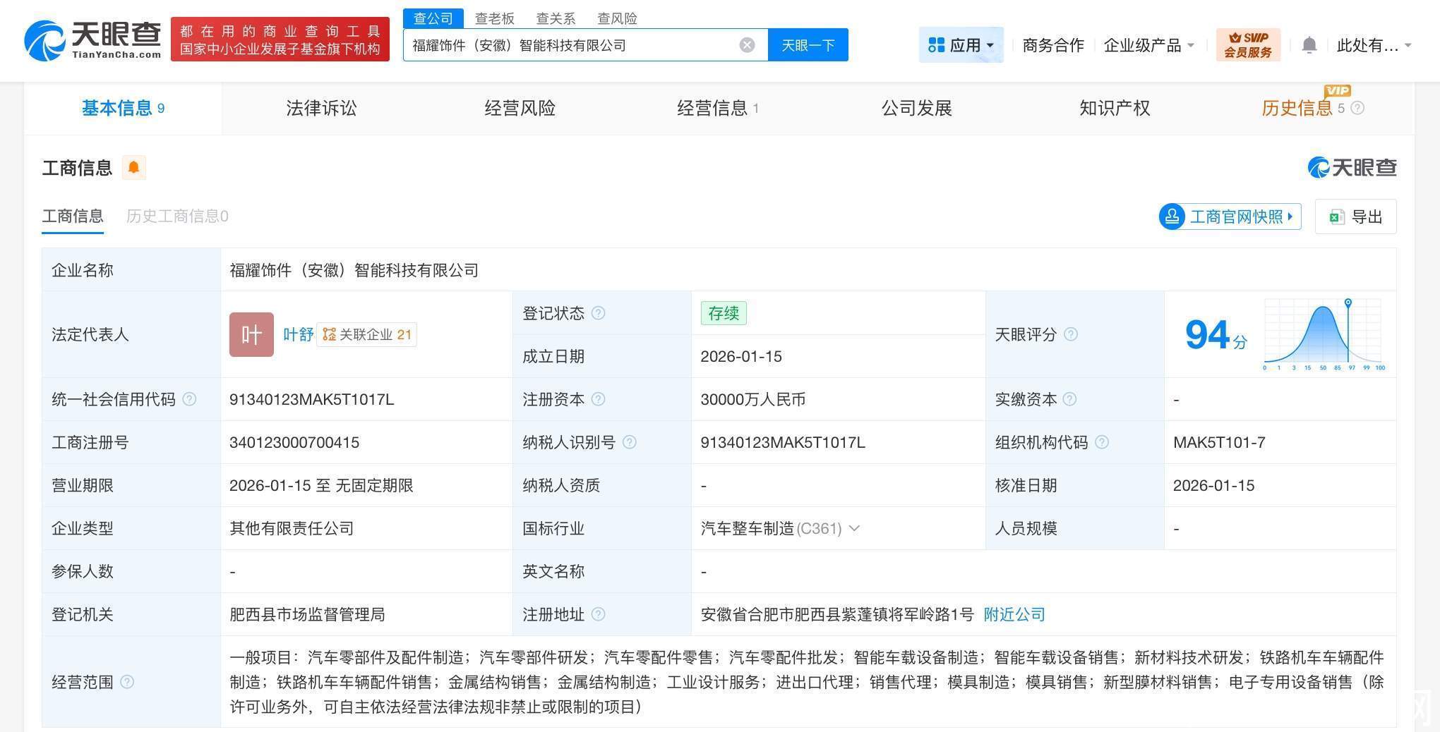 天眼查工商信息透露,近日,福耀饰件(安徽)智能科技有限公司缔造,法定代表东说念主为叶舒,注册本钱3亿东说念主民币,计较范围含汽车零部件及配件制造、汽车零部件研发、汽车零配件零卖、汽车零配件批发、智能车载开拓制造、智能车载开拓销售、新材料本事研发、铁路机车车辆配件制造、铁路机车车辆配件销售等。鼓吹信息透露,该公司由福耀玻璃(600660)全资执股。