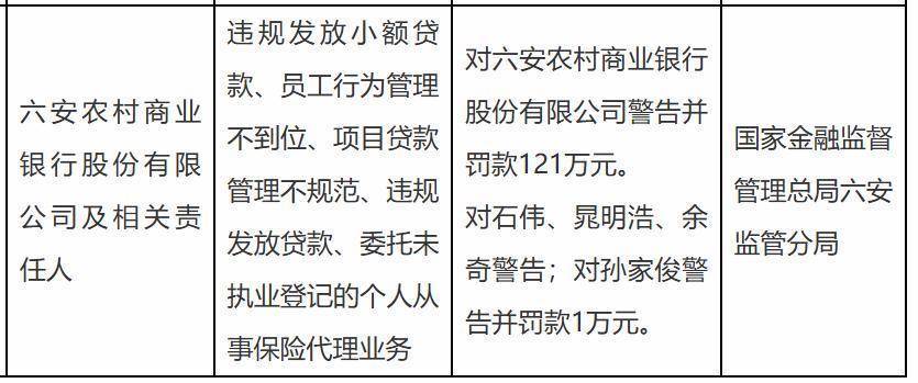罚单剖析,六安农村营业银行股份有限公司存在违纪披发小额贷款、职工步履处置不到位、形势贷款处置不秩序、违纪披发贷款、奉求未捏业登记的个东说念主从事保障代理业务的违纪步履。